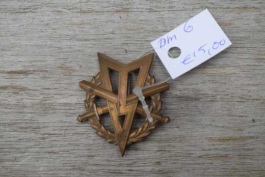 Brass badge showing a brass V over two crossed swords over a laurel wreath. The badge has a working brooche on the reverse side.