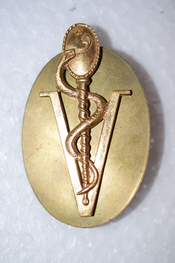 Dutch Royal Air Force Medic badge. Very nice brass emblem showing a Medical sign with the Esculap snake over a large V (=Verpleger=Medic).