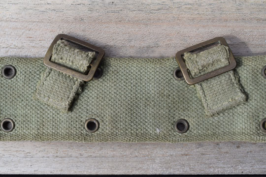 US WWII combat khaki web belt. Excellent adjustable green khaki infantry combat /pistol belt. The belt differs from the English pattern by two rows of brass hanging rings and no a single row.