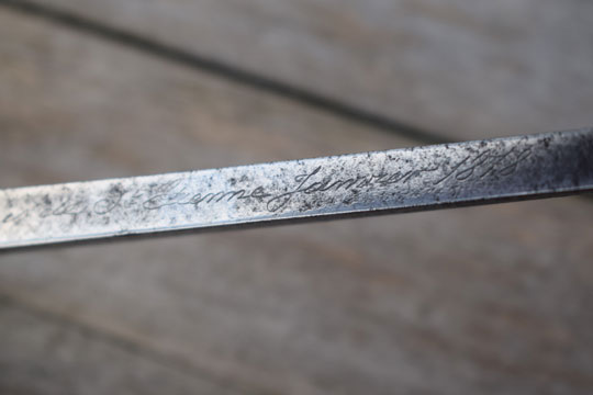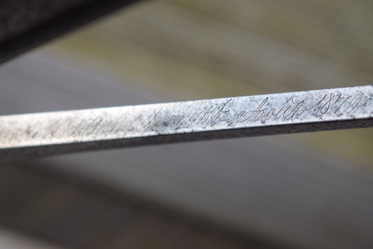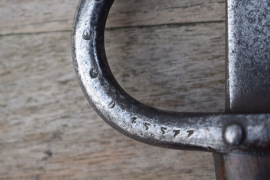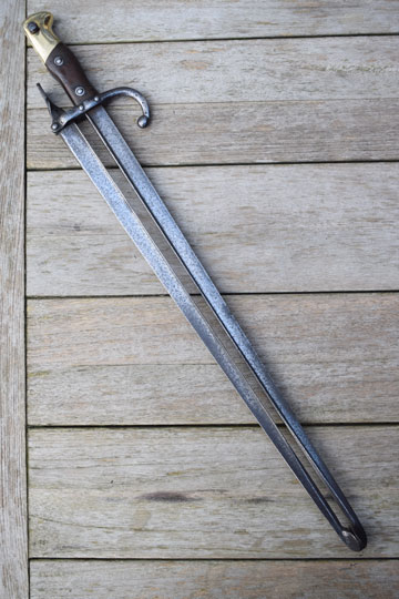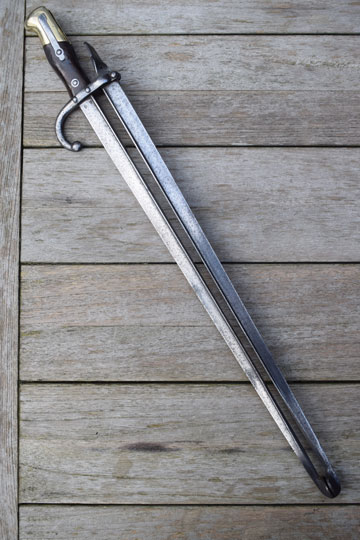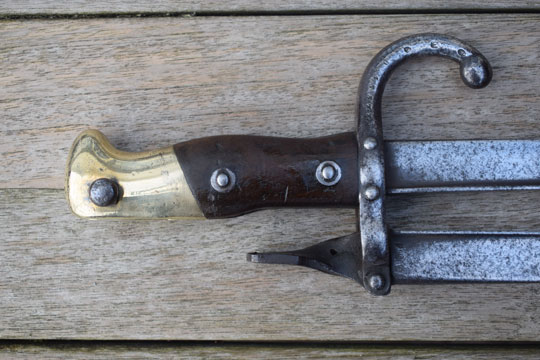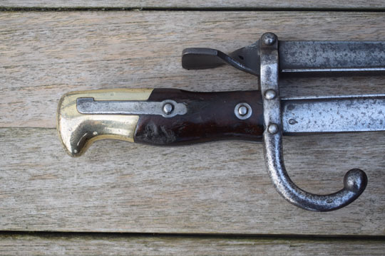 The added Gras blade has also its makers name and date: Mft. d'Armes de Chatl. Aou 1879 (= Made at the Chatellerault Arsenal, August 1879) on the blade spine. The tang of the added blade is twisted, thus forming a tumb rest to manipulate the tong.
