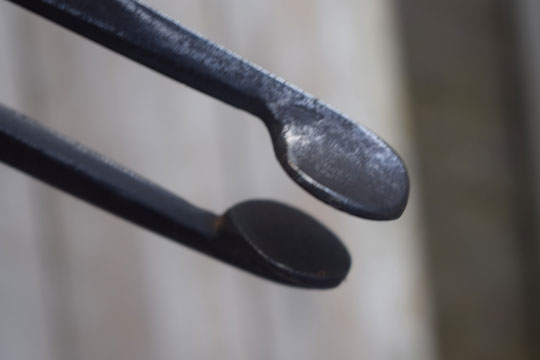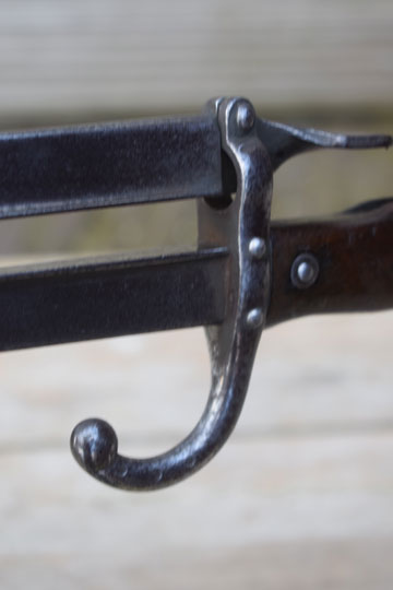 Fireplace tong made from two M 1874 Gras bayonets. Very nice tong made from a French made M 1874 Gras bayonet and the blade of an another French made M 1874 Gras bayonet attached to the muzzle ring of the bayonet and fixed by a rivet. On both blade tips round platforms are welded. Both blades show small stains only.