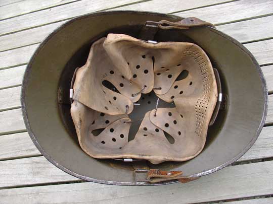French Engineer WWII Adrian M 1926 helmet Untouched green/brown helmet with age spurs. Engineers badge with Roman helmet and torso with RF (=Republique Francaise). Very good liner and leather chin strap.