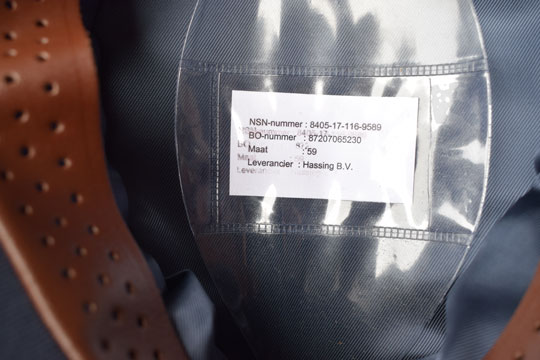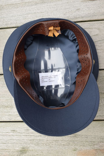 Dutch service dress visor cap for an officer of the Dutch Royal Air Force. Minty blue fabric peaked officers visor cap. Blue top and visor, black band with black patent leather chin strap. Gilt embroidered Royal Air Force badge showing the royal crown over a gilt flying eagle over gilt laurels.