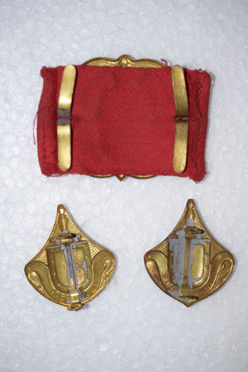 Set of 1 Post WWII Dutch Infantry Regiment cap emblem and 2 collar emblems. Large brass cap emblem, showing a sword and a shield over a scroll with NULLI CEDO. The badge comes with its red cloth. 2x brass collar emblems showing a sword and a shield over a scroll with NULLI CEDO.