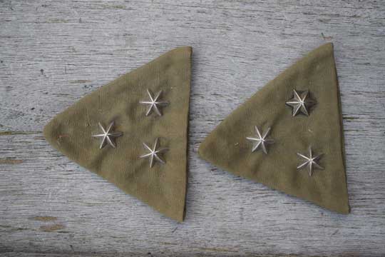 Set of 2x Post WWII Dutch KNIL officers battle dress collar pips on khaki padges. Two khaki collar padges as worn on a battle dress collar by an officers outside the Netherlands. Three stars indicate the rank of captain.