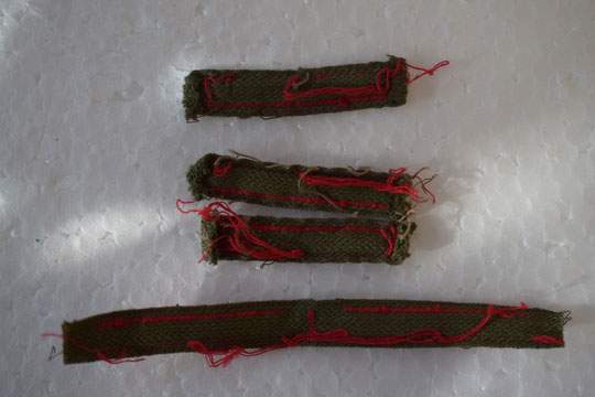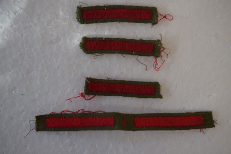 Set of 5 WWII British battle dress service stripes. Red stripes on green cloth.