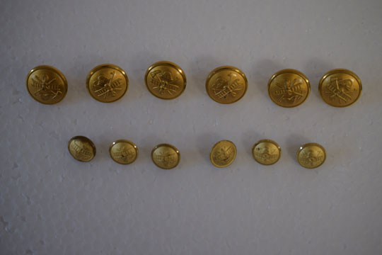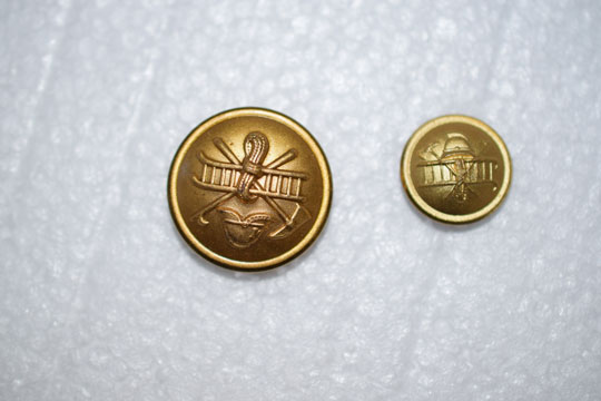 Set of 6 x large and 6 x small Dutch Post WWII brass fire brigade uniform buttons. 6 large brass buttons showing a latter, a fire worker helmet, a rope, a pike and an ax over a smooth back ground. The reverse side is marked M. KRAAYER KZ, WORMERVEER.. 6 small buttons showing the same attributes and the reverse side is marked A and A&S and 15 m.