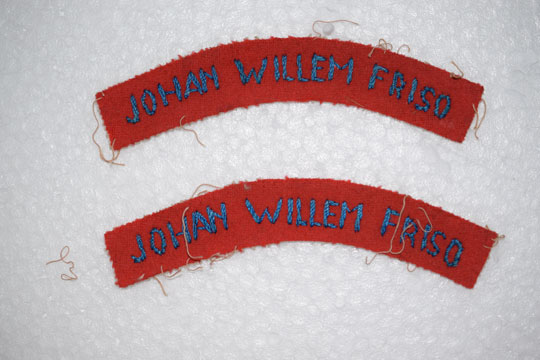 Set of 2 early Dutch Post WWII shoulder flashes: Red cloth and blue letters: JOHAN WILLEM FRISO.