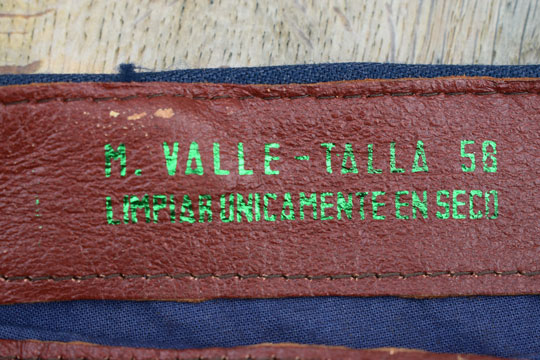 Inside is marked in green: M. VALLE - TALLA 58 (Size 58) and LIMPIARUNICAMENTE EN SECA